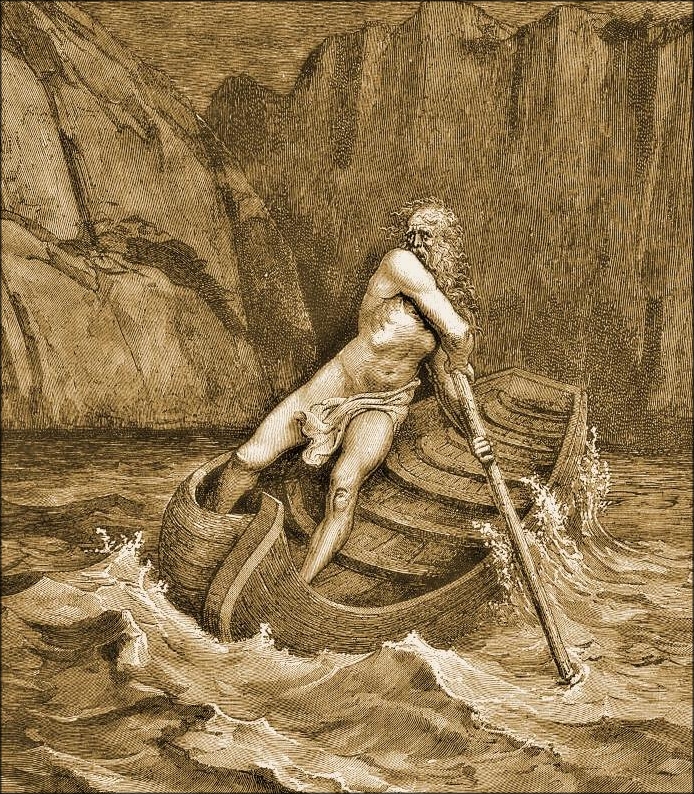 Charon the demon, with the eyes of glede, beckoning to them, collects them all together, beats with his oar whoever lags behind.